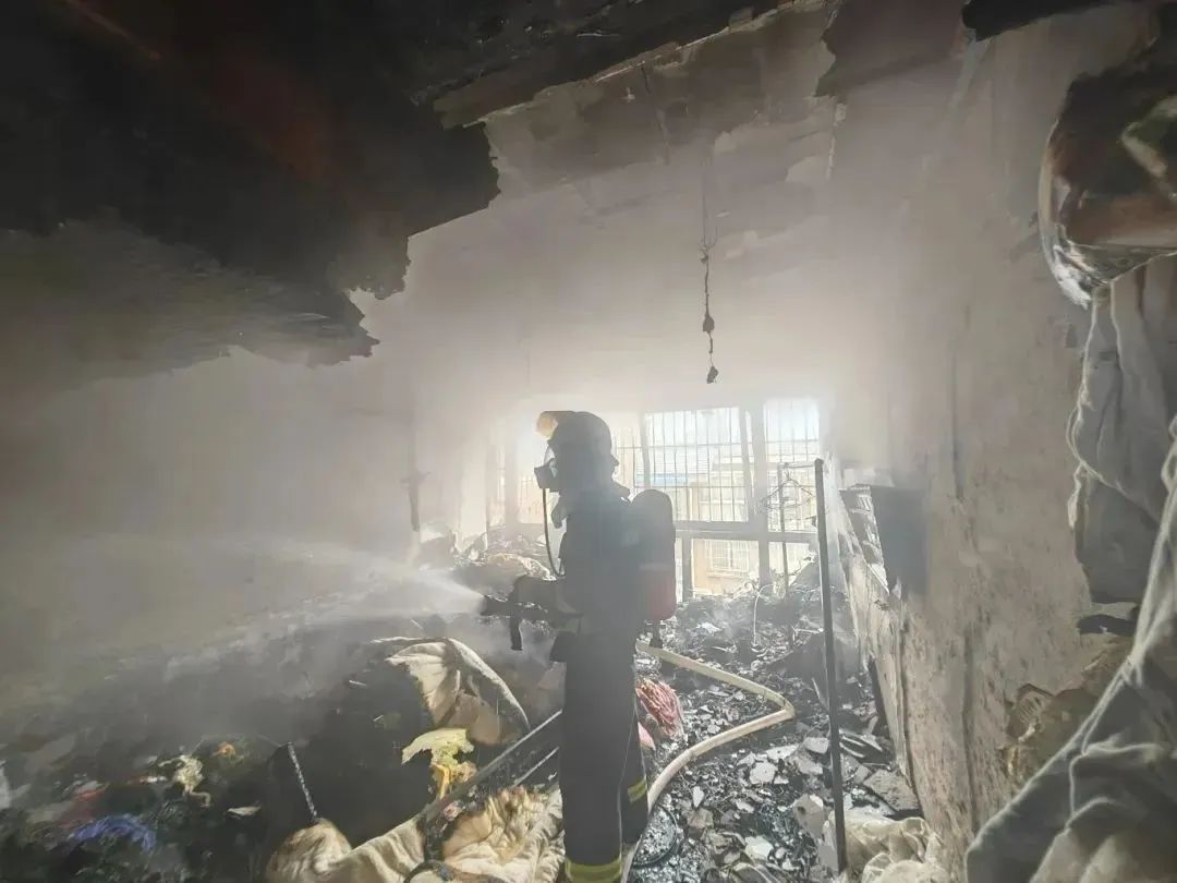 經過緊張處置,成功將火勢撲滅。然而,室內已是狼藉一片,臥室墻面全部燒毀脫落,家具、被褥、衣物等也已燒焦。