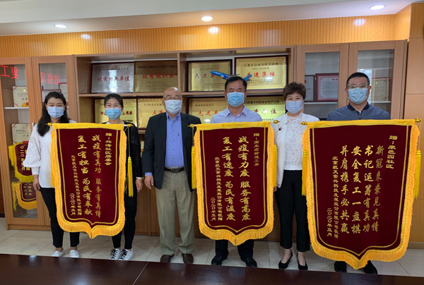 2020年5月12日,北京航天常興科技發(fā)展股份有限公司董事長楊迺文、總經(jīng)理王德坤及董事會秘書趙琳向高米店街道工委、興濤社區(qū)居委會、康邑園社區(qū)登門拜訪并贈送三面錦旗。