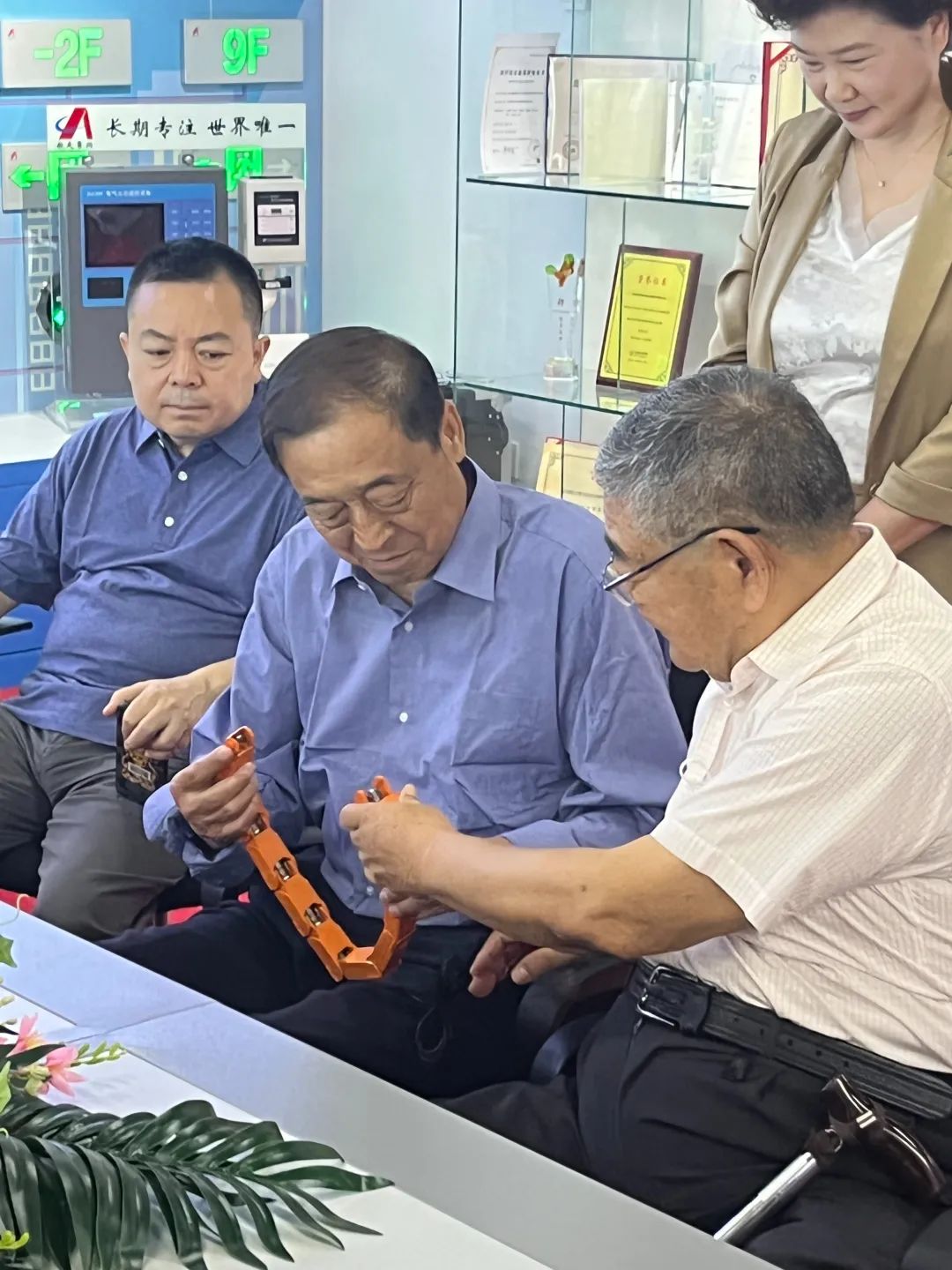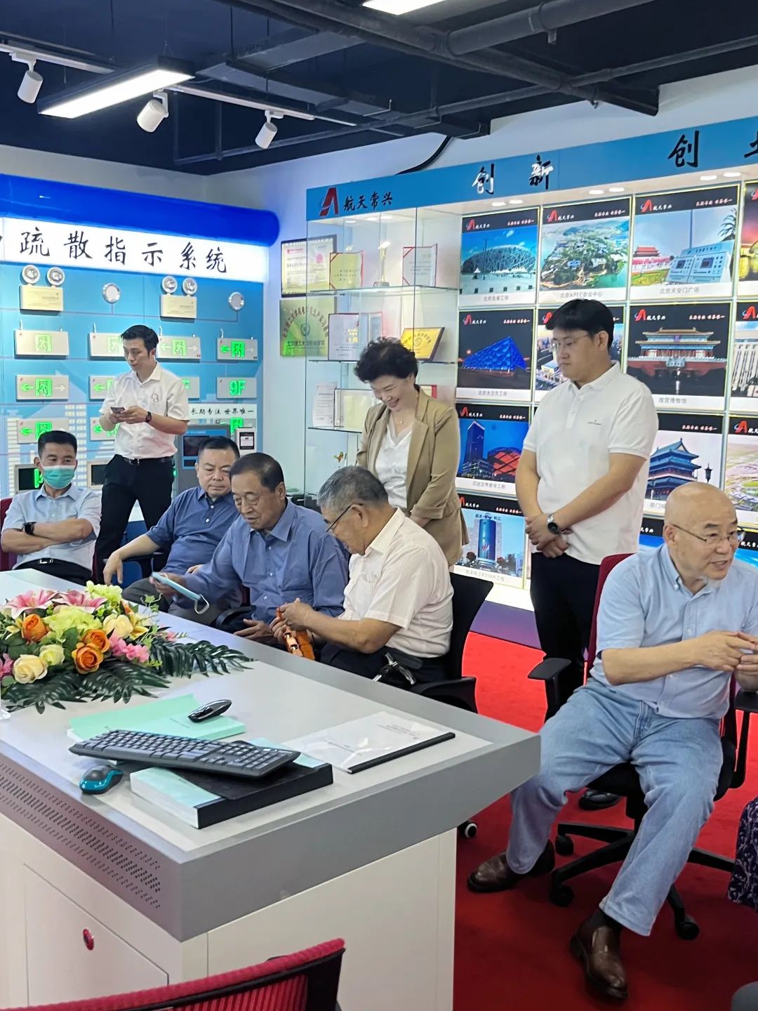 2022年6月30號,欣聞航天常興開發出“電衛士”,幾個年逾七十的北理工校友,由老書記焦文俊和原北京市副市長趙鳳桐帶領幾位優秀的老師和企業家來到公司考察。中國安防協會無人安全委員會主任吳志強將軍和航天常興研究院執行院長伍林陪同。