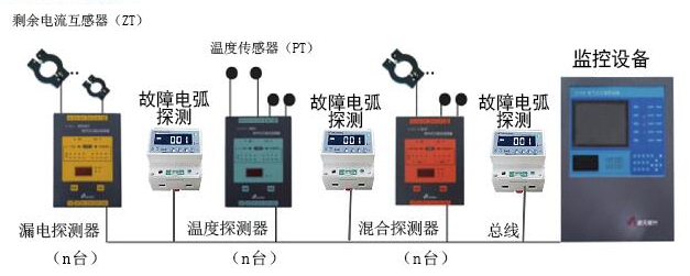 故障電弧探測器具有信號上傳功能, 故障電弧探測器可以通過 RS485 串口與上端電氣火災(zāi)監(jiān)控設(shè)備進(jìn)行通訊,可以將正常信號和報(bào)警信號上傳,并可通過上端電氣火災(zāi)監(jiān)控設(shè)備對下端故障電弧探測器進(jìn)行報(bào)警復(fù)位。實(shí)現(xiàn)了智能統(tǒng)一控制管理。