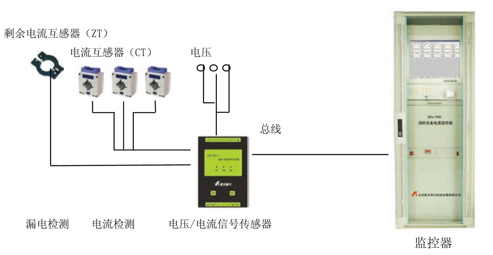 消防設備電源電壓/電流信號傳感器安裝于配電盤或配電柜內,監(jiān)控器安裝于值班室。