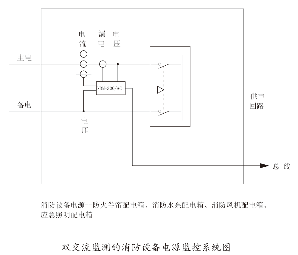 消防設備電源監(jiān)控系統(tǒng)用于一般工業(yè)與民用建筑中AC220V/380V配電線路中安裝的消防設備電源的在線監(jiān)控,當消防設備電源發(fā)生過壓、欠壓、過流、漏電、缺相等故障時監(jiān)控系統(tǒng)能立即發(fā)出報警信號,可及早發(fā)現(xiàn)問題從而避免各種事故的發(fā)生。